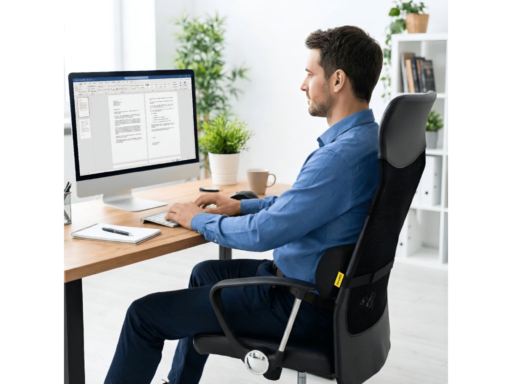 Díky dlouhému elastickému popruhu je možné bederní opěrku upevnit téměř ke každé židli či sedačce a vydrží tak na správném místě po celý den.