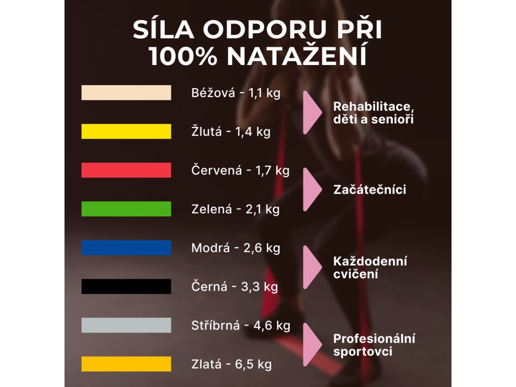Síla odporu posilovací gumy Thera-Band (100% natažení)